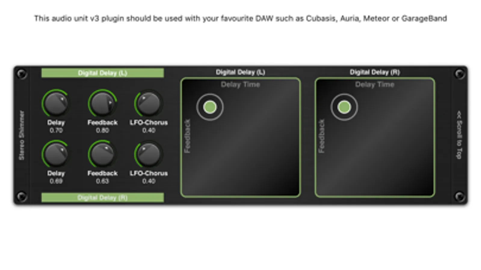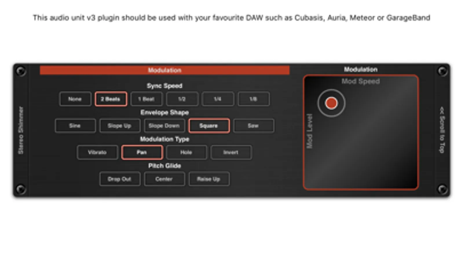 This is an AUv3 compatible effect which must be used as plugin with your favourite DAW such as Cubasis, Meteor, Auria or GarageBand. It supports a modern graphical interface and presets with stereo meters for monitoring signal levels.
