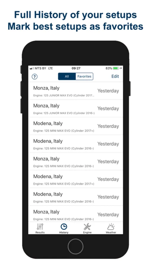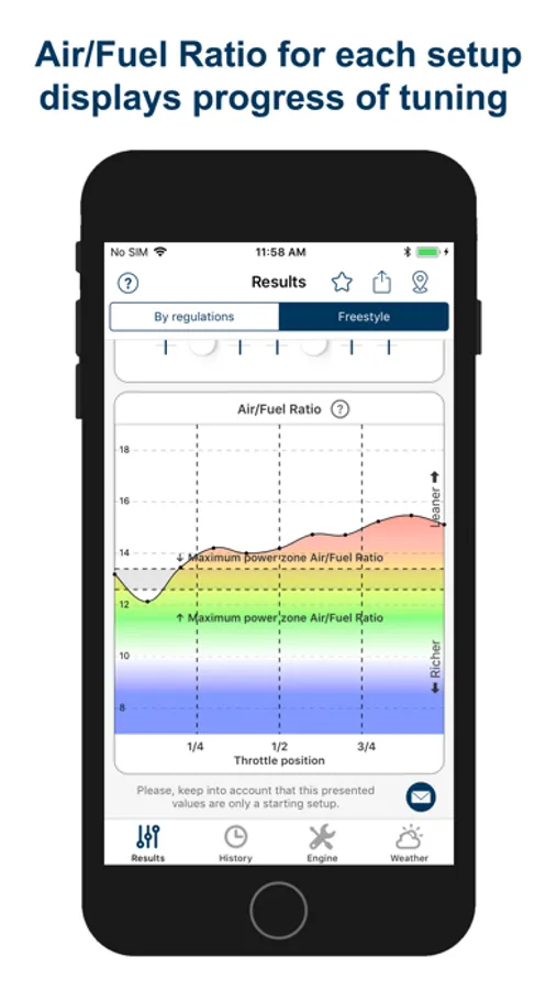 • History: This tab contains the history of all jetting setups. If you change the weather, or engine setup, or fine tuning, the new setup will be saved in history