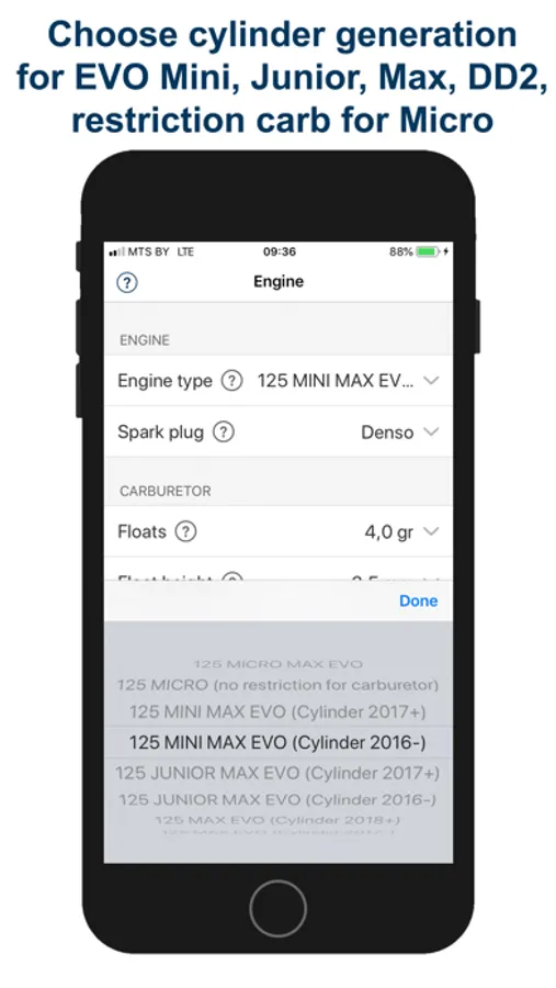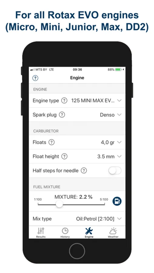 This app provides, using temperature, altitude, humidity, atmospheric pressure and your engine configuration, a recommendation about jetting and spark plug to use for karts with Rotax 125 Max EVO (Micro Max Evo, Mini Max Evo, Junior Max Evo, Senior Max Evo, Max DD2 Evo) engines, which use a Dellorto VHSB 34 XS carb