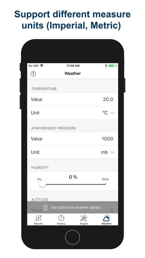 • Possibility of use automatic weather data or a portable weather station via Bluetooth: Kestrel DROP & 5x00, WeatherFlow WEATHERmeter, Skywatch BL