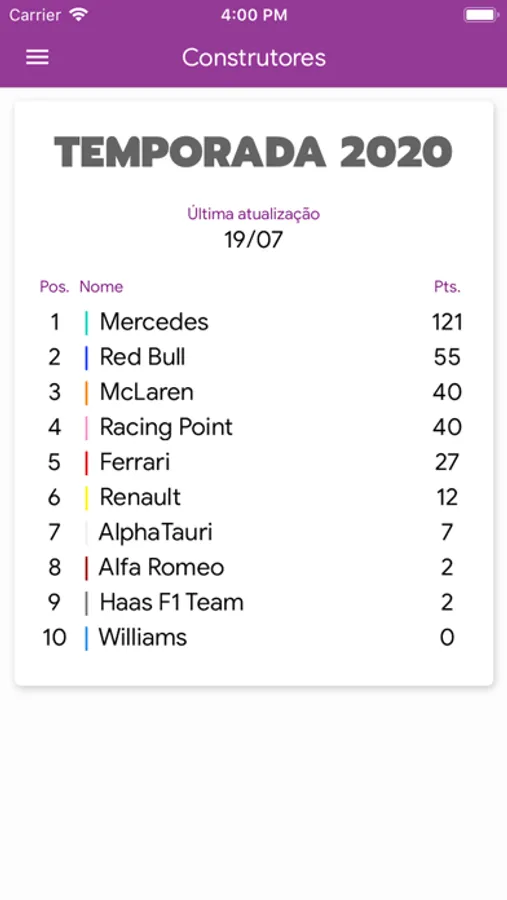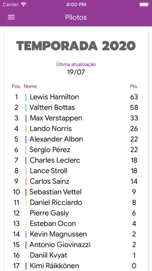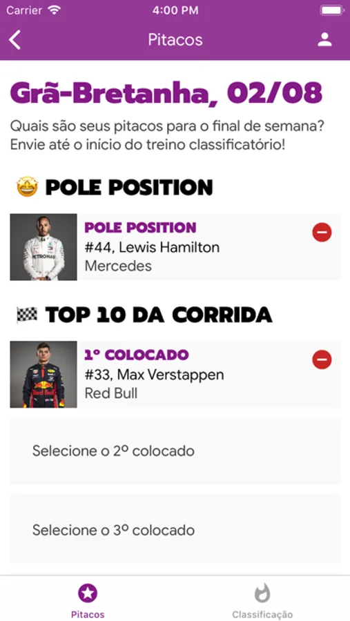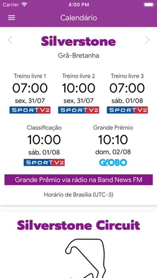 - Notificações com lembrete de eventos (treinos livres, classificação e grande prêmio);