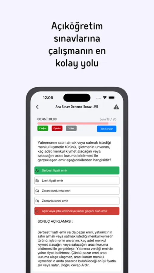 * "kendimi denemek istiyorum'u seçerseniz 30 dakikalık bir sınav başlar ver süre sınırı dahilinde çözüm yapabilirsiniz. Sınavı bitirdiğinizde detaylı sonuçlarınız ekrana gelir, istediğiniz soruya bakarak seçimlerinizi inceleyebilir yanlışlarınızı kolayca görebilirsiniz
