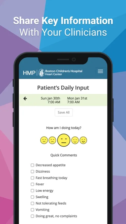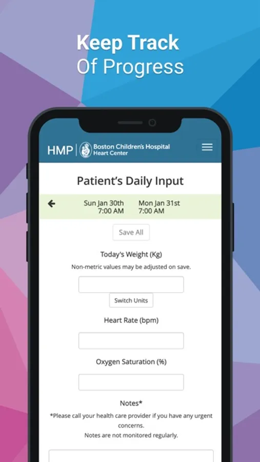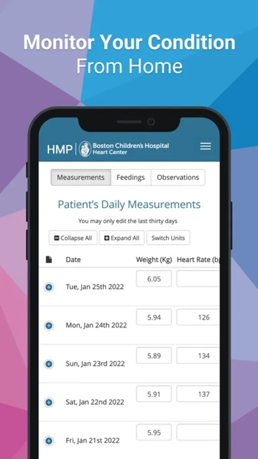 With the Heart Center Home Monitoring Program, Boston Children's Hospital Heart Center patients can send clinicians key clinical information, including weight, oxygen saturation, formula/fluid amounts and other important information that can help improve your care. Simply send your information from home or on the go using any smart device. Your team at Boston Children's will review this information to monitor and improve health, decrease trips to the hospital, and give you more control over your care.