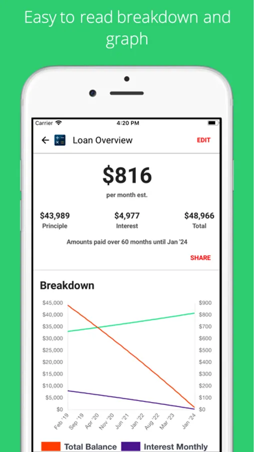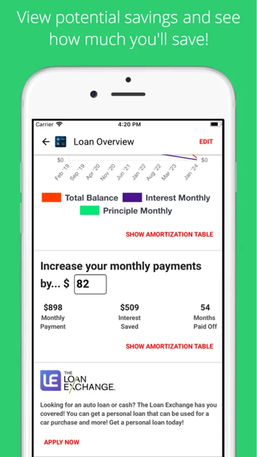 Even see how much you would save if you paid $X more per month. Great way to understand how much interest you would save and how much faster you would pay it off!