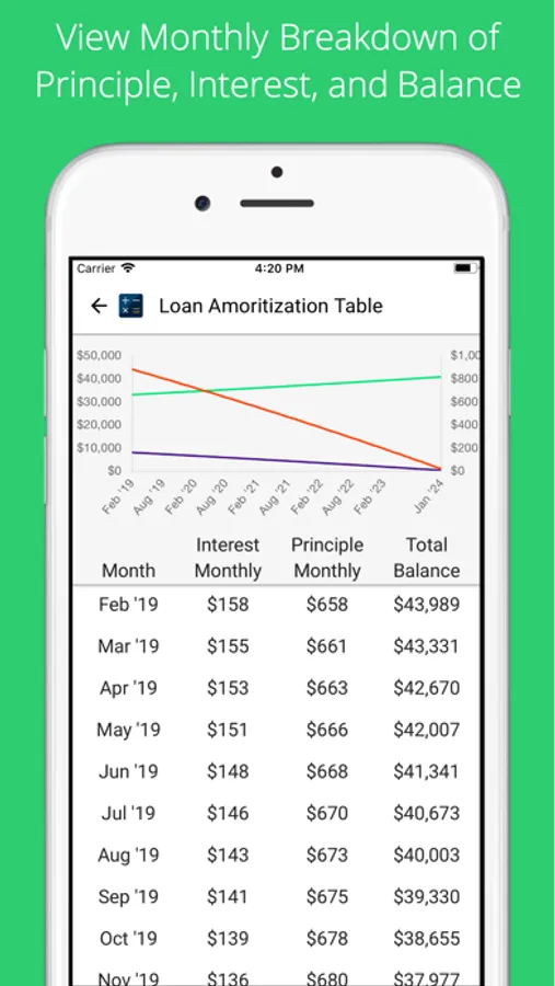 Get a monthly breakdown of you payments and see where your payments are going each month, along with a pay off date. Complete with a monthly breakdown for Principle, Interest, and remaining balance.