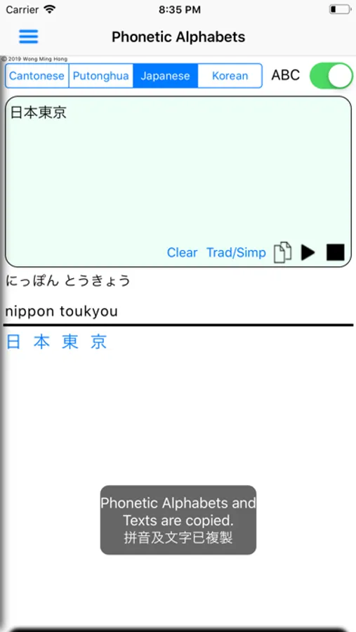 2. Provides the function of copying the phonetic alphabets and Traditional and Simplified Chinese translated words to clipboard. It provides four copy formats to clipboard.