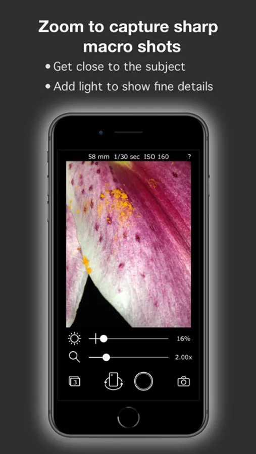 Light is everything in photography. Flash in other camera apps can be unpredictable and overpower the photo. We transform it into a continuous configurable light, which makes it vastly more useful. Add the perfect amount to highlight your subject and strike the perfect foreground to background balance. Combine light with zoom to improve photo sharpness and capture hard to see details, which is great for close-ups.