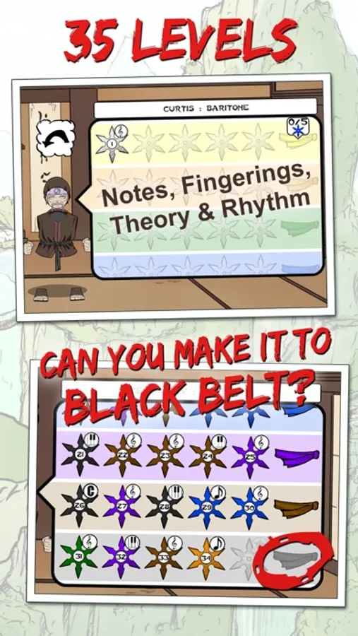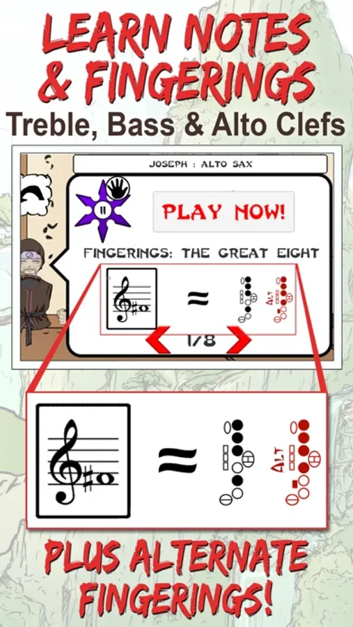 The only music mastery app featuring all instrument NOTES, FINGERINGS, RHYTHMS & THEORY. Add UNLIMITED student users for one small price! The new ninja customization allows students to personalize their ninja's looks. Let our ninja master test and motivate your piano, string, brass, woodwind, or percussion students to conquer the essentials of music notation. Fingering graphics are clear and attractive, with appropriate ALTERNATE FINGERINGS shown in red. Your remediation troubles are over!