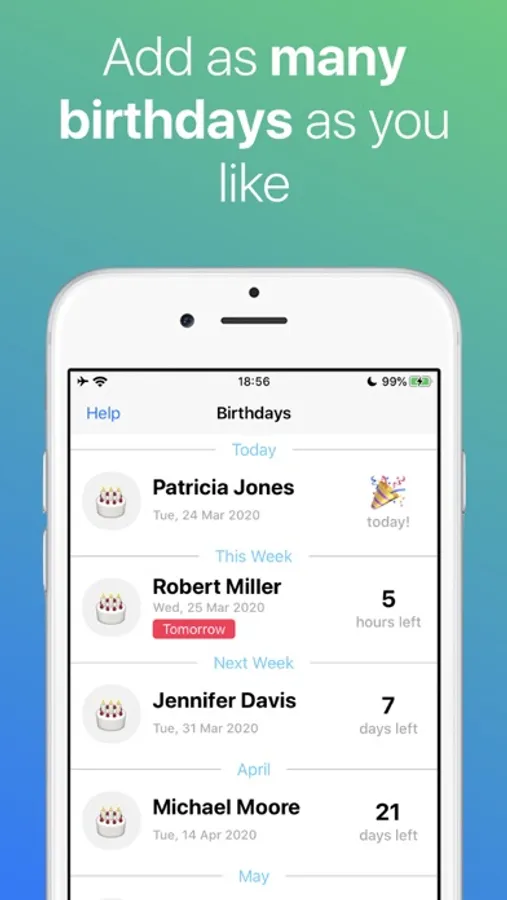 • Get notifications at the time of your choosing on each birthday day. You can also get notified 1 day or 1 week before each birthday