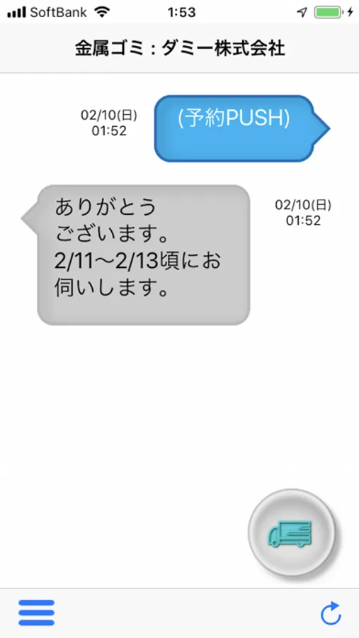 資源回収業者の方から、このアプリを紹介された時は、チャンスです。あなたはこのスイッチを押すだけでよく、あとは回収業者の方から、お手すきのタイミングで、いつ頃回収に来てもらえるのかのメッセージが届くようになります。