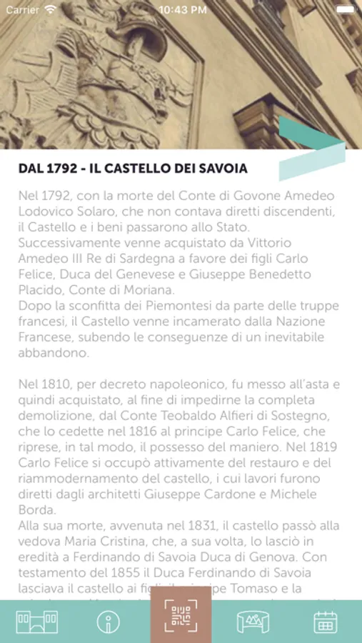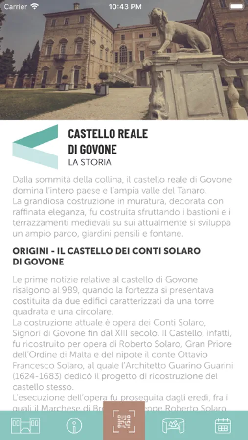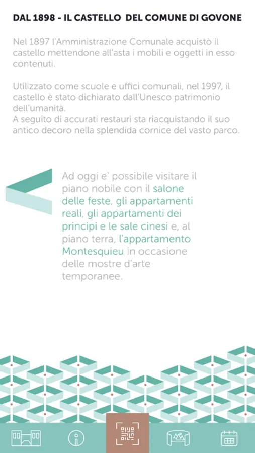 l'applicazione consente le visite del Castello Reale di Govone in autonomia con contenuti multimediali e percorsi dedicati a bambini, ipovedenti e non udenti. Tutto ciò è stato realizzato grazie al contributo della Compagnia di san Paolo e della fondazione Cassa di risparmio di Cuneo