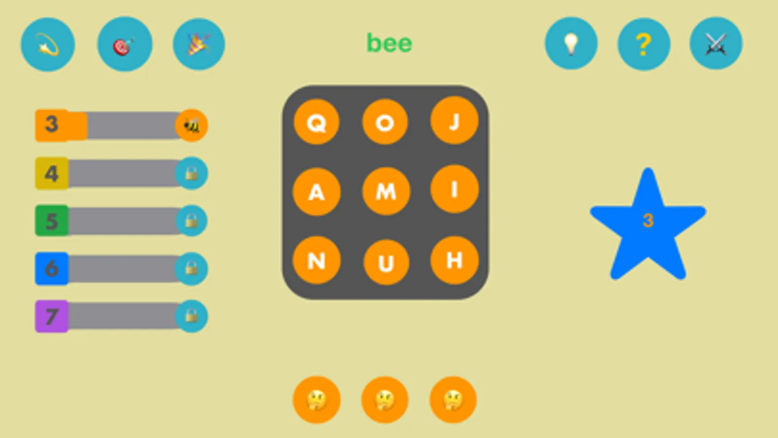 Bee - A spelling game for the whole family. You have nine letters to spell as many 3 to 7 letter words as you can. Each game has random letters hence unlimited replayability. AND there’s hints to help you learn new words.