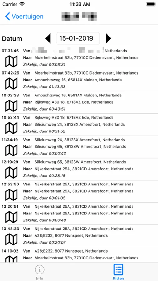 In de app heeft u inzicht in de actuele locatie, de gereden ritten, hoe de rit gereden is, uw aangemaakte poi en kunt u navigeren naar uw voertuigen of poi’s.