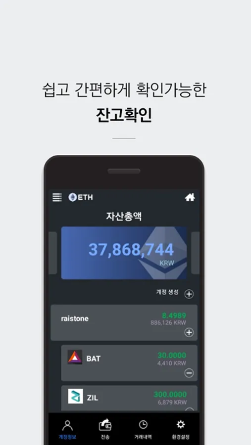 - 계정 별, 코인 별, 토큰 별 잔고, 시세 표시. (KRW(원), USD(달러) 등 32개 통화로써 자산가치를 보여 줌)