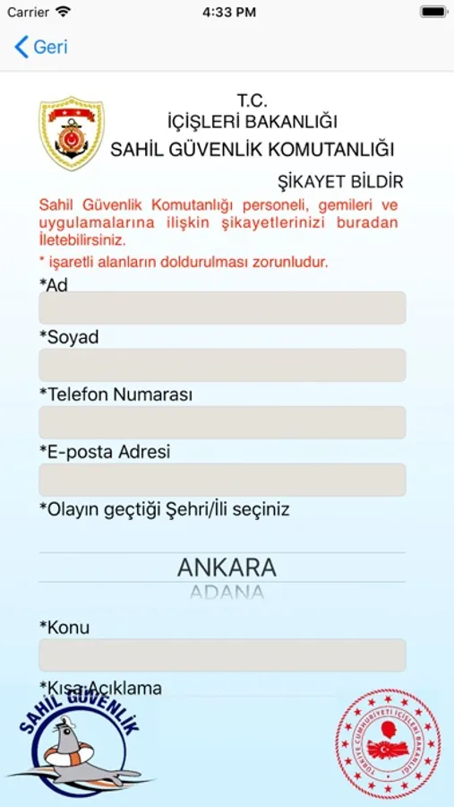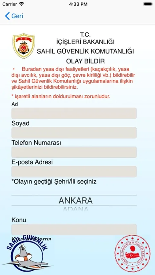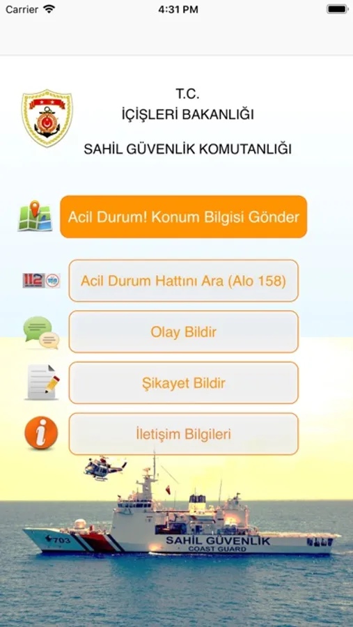 T.C. Sahil Güvenlik Komutanlığı, ulusal ve uluslararası hukuk kuralları gereğince egemenlik ve denetimi altında bulunan deniz alanları ile uluslararası sularda, uluslararası sözleşmeler çerçevesinde belirlenmiş olan Türk Arama Kurtarma Bölgesi’nde deniz güvenliği, asayiş ve kamu düzeni sağlamak ve korumakla görevli kolluk kuvvetidir. AppStore’da kullanıma sunulan uygulama Komutanlığımız tarafından geliştirilmiş olup denizde yardıma ihtiyacı olan herkesin kullanımına sunulması hedeflenmiştir. Uygulamayı kullanan herkes tek tıkla acil yardım talebinde bulanabilir, konumunu en yakın 7/24 görev yapmakta olan Sahil Güvenlik birimine gönderebilir. Buna ek olarak uygulamanın olay bildirimi ve şikayet bildirme özellikleri sayesinde kişiler ihbar veya şikayetlerini kolayca Komutanlığımıza gönderebilir, Komutanlığımızın iletişim bilgilerini görüntüleyebilir.