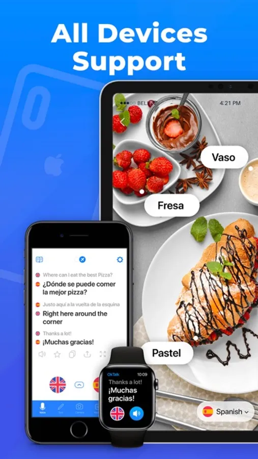 Apply a smart assistance in café, restaurants, shop, pharmacy, taxi and hotel booking during your trips. Use OkTalk as personal facilitator having small talks and asking for direction. Translate boards and signs through camera, get help from locals using simultaneous voice translation.