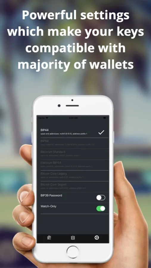 The app only allows the industry standard BIP44 or BIP84 derivation scheme which is compatible with the majority of hardware wallets and apps. It also utilises BIP39 pass-phrases but that can be switched off in settings.
