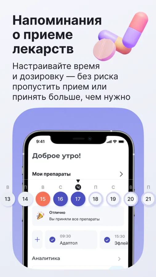 • Дневник лекарств — напоминание и контроль приема лекарств, информация о препаратах, дозировке, курсе и кратности приема;