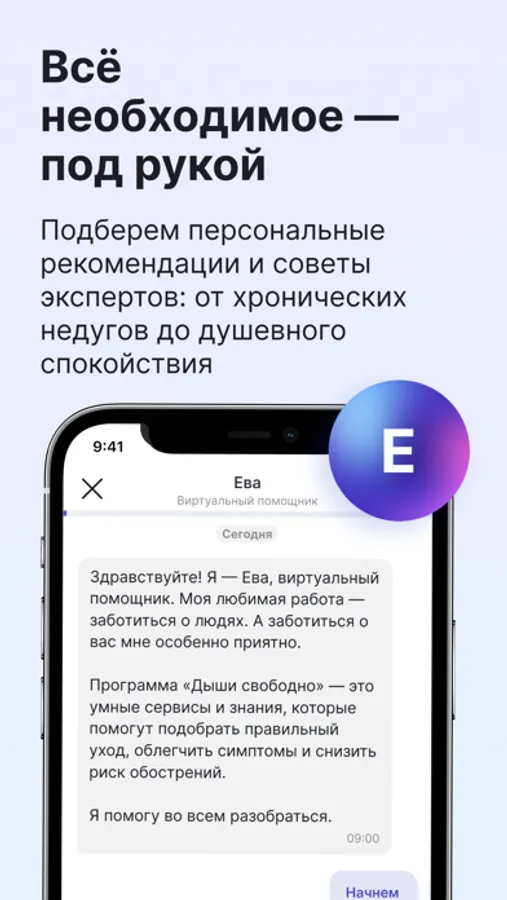 • Дыши свободно — программа для людей с бронхиальной астмой. В программе вы получите бесплатную консультацию врача, узнаете о современных методах лечения и сможете отслеживать триггеры в умном дневнике;