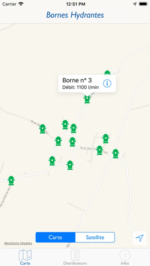 - Indique le débit, la pression, le modèle de borne hydrante, etc.