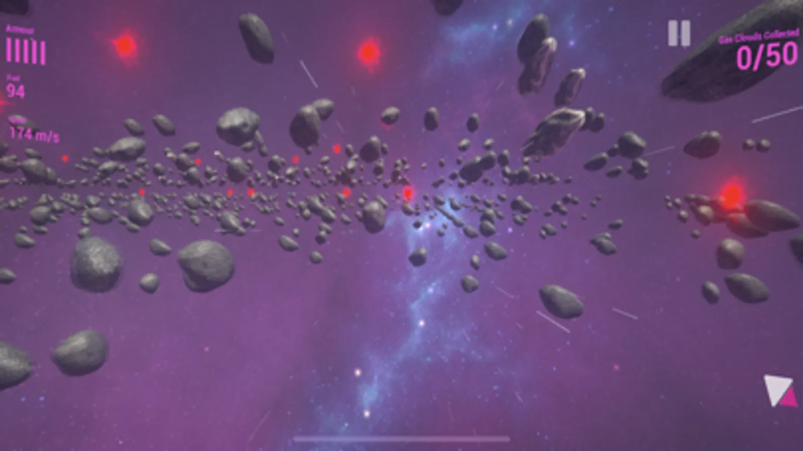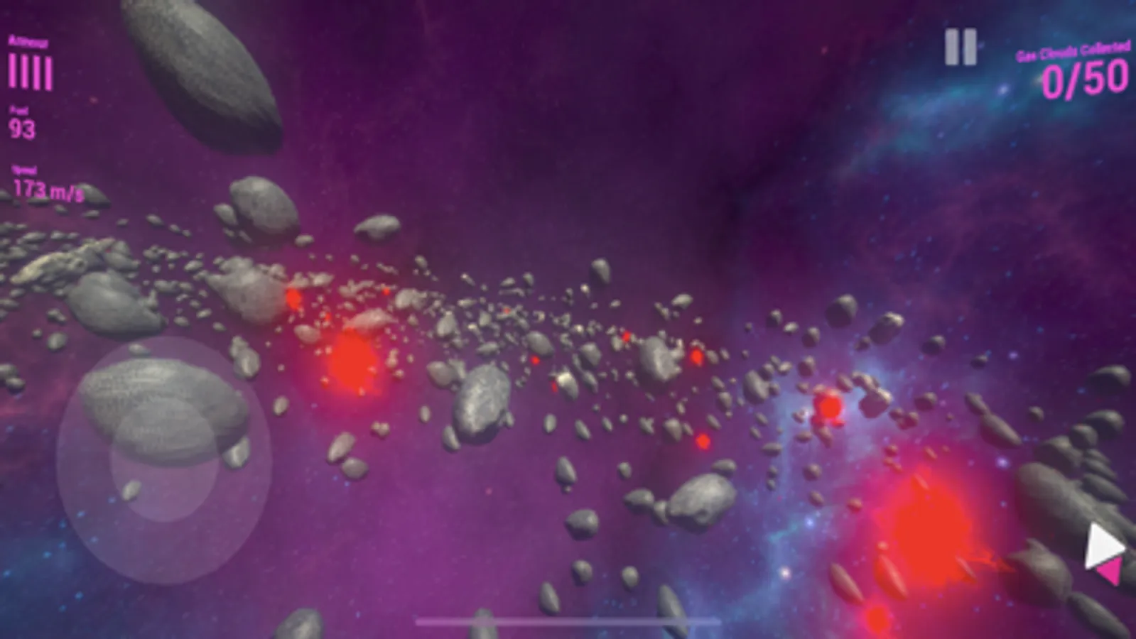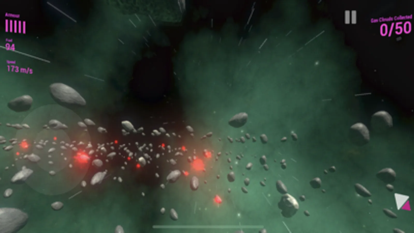 Avoid collisions with drifting asteroids, as this will damage ship's armour. If you run out of armour, the level will start from the beginning and all collected gas clouds will be lost.