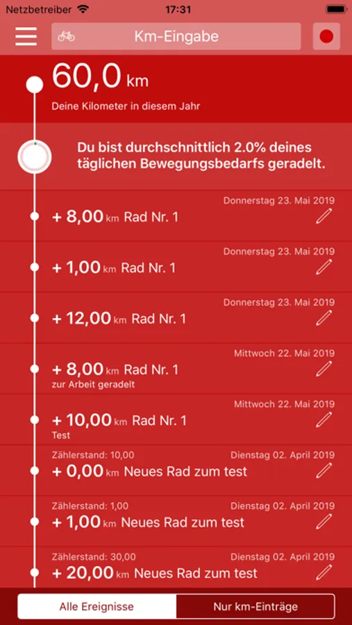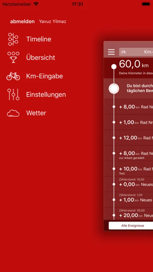 Erfassung der im Rahmen von RADIUS „Vorarlberg radelt“ geradelten Kilometer. Gibt Einblick in die persönliche Statistik der geradelten Distanz, bietet die Möglichkeit, geradelte Entfernungen und Höhenmeter von einzelnen Strecken "mitzutracken", sich persönliche Radler-Ziele zu setzen oder mit Freunden zu vergleichen, ein Teamrennen durchzuführen, die Wetterprognose abzurufen und Dienstfahrten mit dem Fahrrad einfach zu erfassen.