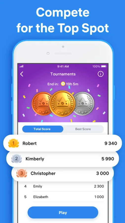 - Compete against other players in Tournaments, beat your high score, and climb the leaderboard.