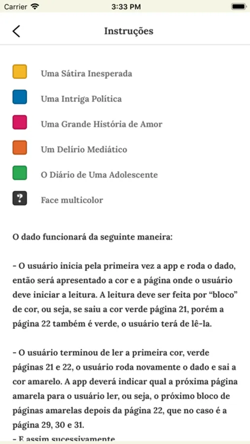 Pode lê-lo como todos os outros, do princípio até ao fim, sem se preocupar com as cores. Pode ler a história completa de cada uma das cores separadamente e de forma contínua. Pode tornar a experiência ainda mais radical e interactiva através desta app onde encontrará um dado que lhe indicará qual a sequência e a cor que deve ler a seguir. Poderá depois partilhar e conhecer as experiências de leitura de outros leitores.