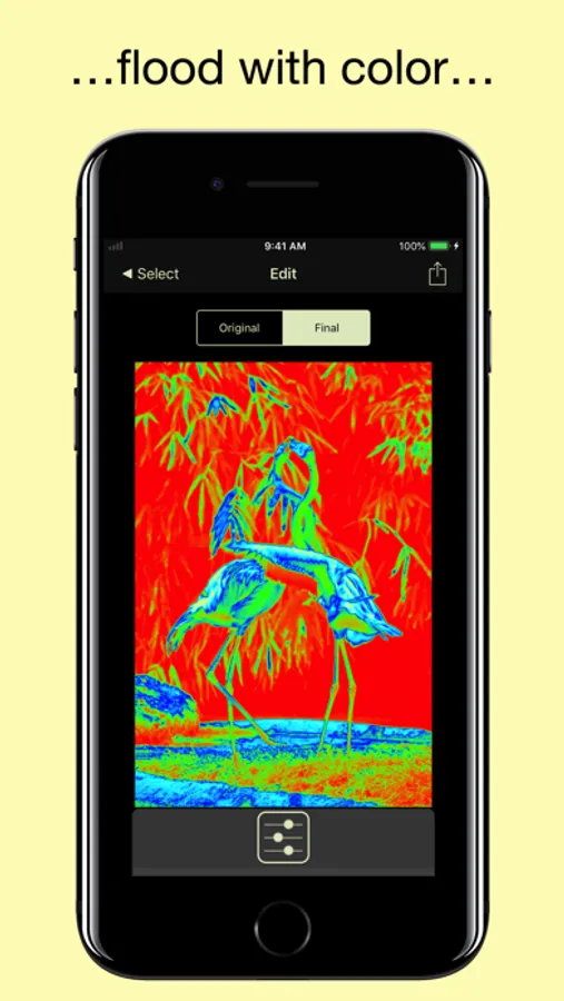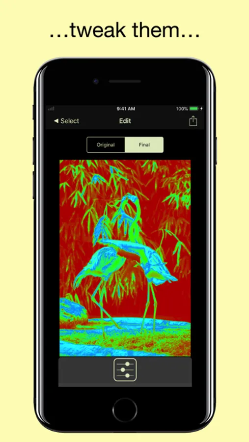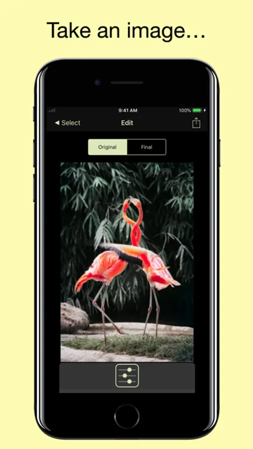 Use an image from your Library, or a new one from your camera. When you’re done, share with Facebook/Twitter/Flickr (login required), or save to your library, print, message or email.