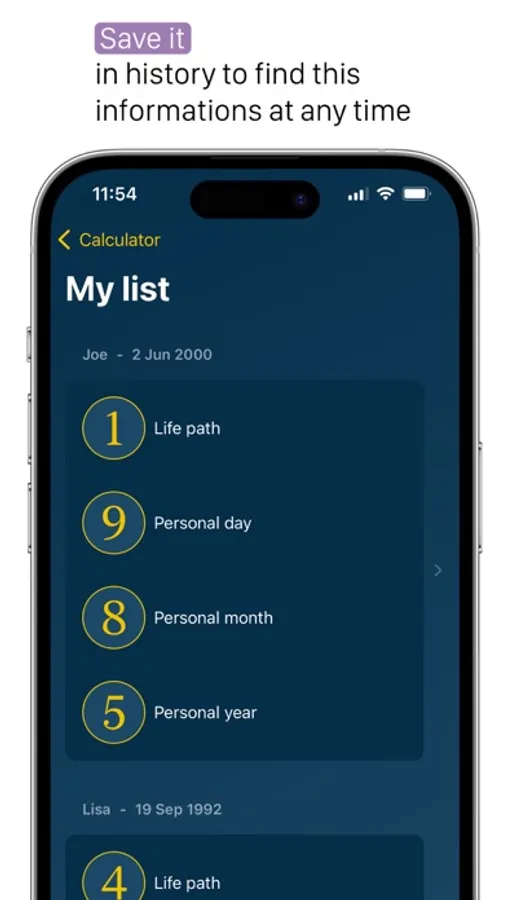 You have the possibility to save all your searches in a list. This way you can see which people around you share the same life path, personal year, personal month or personal day as you.