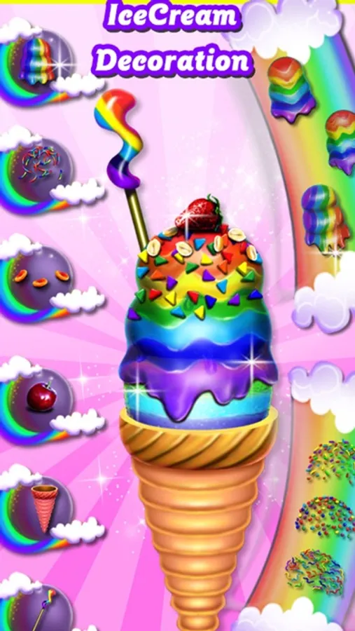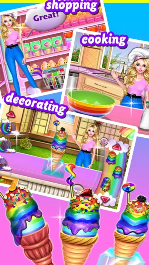 First of all you should buy all the neccessary ingredients from the supermarket so go there and find them all. Next it's the cooking session where you should mix the ingredients as the recipe says to get the perfect rainbow icecream. Complete all the challenges of this step and prove that you are a good chef. Finally you can decorate the rainbow icecream as you want. Choose the cone, the syrup and add some fruit decoration on the top to make the icecream look tasty. Now the icecream is ready to be serve and you can be proud about jour job. Have fun playing this new cooking icecream game and enjoy it!