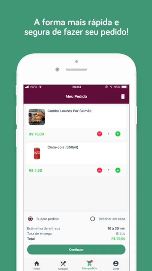 Já que estamos falando em praticidade, já pensou em poder pagar seu pedido diretamente pelo do aplicativo? Isso mesmo, agora você pode usar seu cartão de crédito para pagar por seu pedido antes mesmo do entregador chegar. É rápido, prático e seguro. Diga adeus às maquininhas sem sinal! Mas, se você preferir pagar na entrega, pode escolher entre as outras opções de pagamento disponíveis no app.