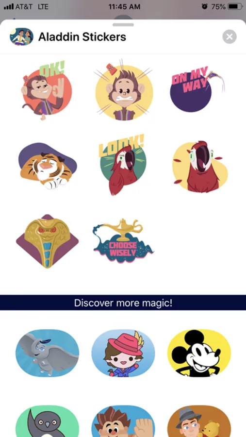 Experience the magic in a whole new way. Download this pack of 23 Disney’s Aladdin animated stickers including Aladdin, Jasmine, Genie, Jafar, Dalia, Abu, Rajah, Magic Carpet, and Iago!