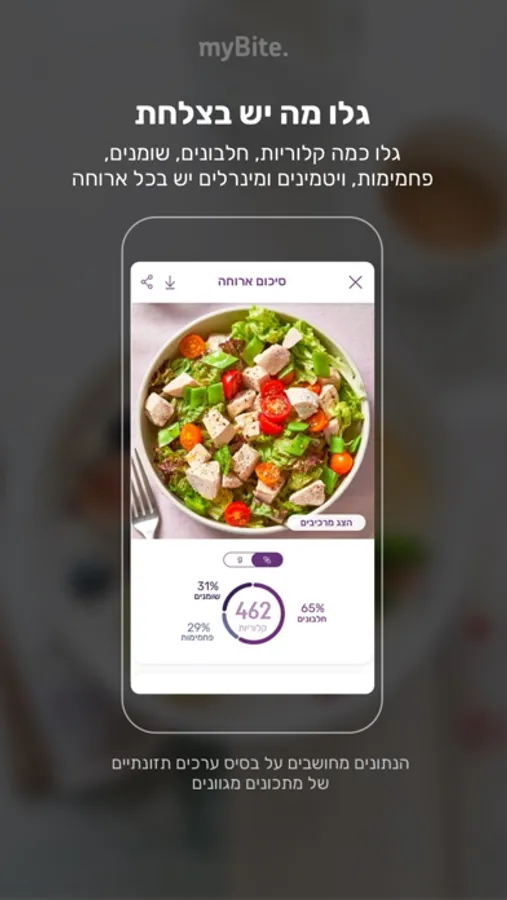 האפליקציה שתעזור לך לנהל יומן אכילה בקלות ובנוחות, על ידי הזנה ידנית או צילום, נגלה יחד ממה מורכבת המנה שלך.