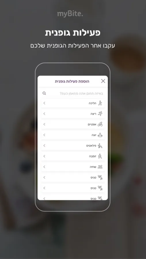 הוספת סוג הפעילות הגופנית אותה ביצעת וחיבור myBite למד הצעדים של Apple Health יאפשר לך לראות כמה קלוריות שרפת מהפעילות הגופנית שביצעת.