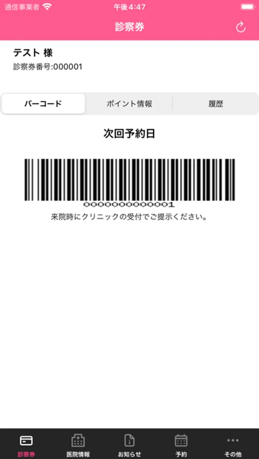 バーコードをかざすだけで受付出来るチェックイン機能、次回ご予約日時表示など、カードレスな診察券としてご活用頂けます。
