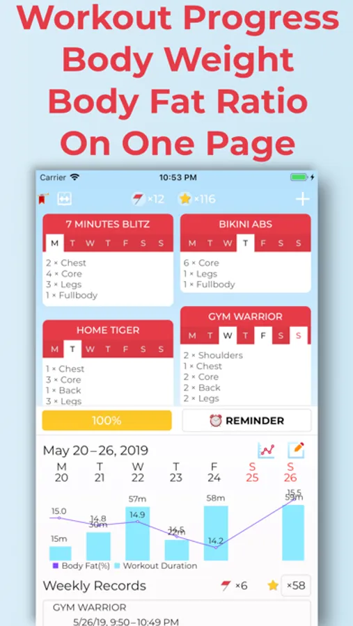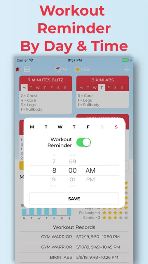 8. Notification reminders on workout day and progress bar to track progress of current week to motivate you towards the goal of exercises every week.