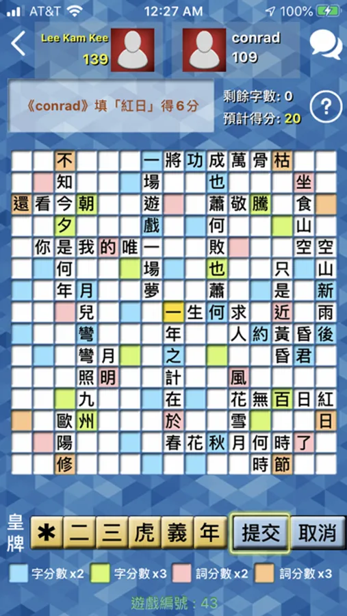 遊戲非常簡單易懂,棋盤上每填一個字有一分,每一個有顏色的方格會把分數加倍,詳情請參考教學部分。