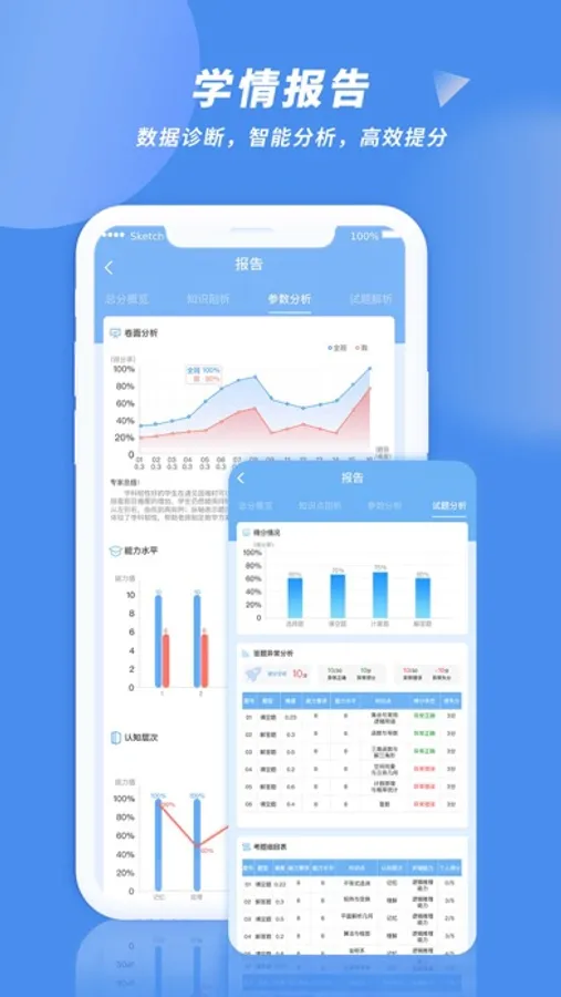 自适应测评深度融合CAT、IRT测评机制,从学科的知识点、认知层次、核心素养、关键能力等,根据学生实际作答结果动态调整测评过程。