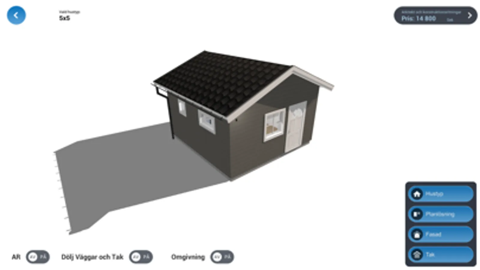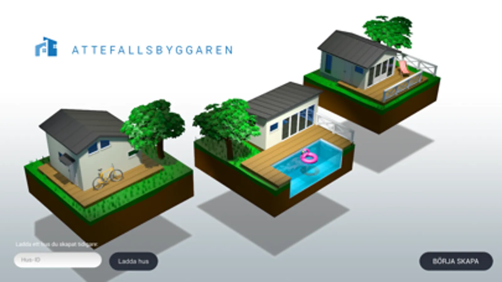 Nu kan ni interaktivt bygga ihop ert attefallshus i 3D och testa olika material och färger. Ni kan sedan i förhandsvisningläget placera ut huset på eran tomt och se hur det kommer att bli på plats! När ni känner er nöjda kan ni skicka in valen för vidare kontakt.