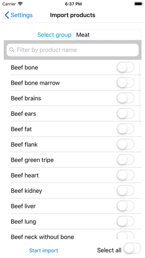 - import most used for raw dog feeding products and sub products (like meat, chicken, turkey, fish, vegetables, fruits ) from our server with macronutrients and calories data filled in
