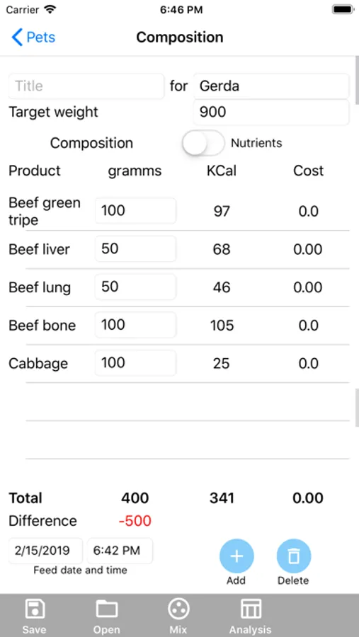 - manage list of products you use in feeding with additional data like calories, protein, fat, carbs, and price of the product
