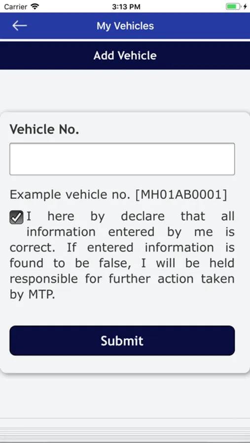 A user can register a vehicle by its number to track e-challans issued against the said vehicle. For the same, Click on the “Add Vehicle” button and enter the vehicle number. Where a mobile number has been registered in the RTO"s Vahan system against a particular vehicle, such a vehicle gets added to the “My Vehicles” list without additional validations. If such a mobile number does not exist in the RTO records, the system shall prompt the user to enter the last 4 digits of the vehicle"s chassis/engine number for a maximum of 10 attempts. A user may add multiple vehicles to the “My vehicles list” against a single mobile number to get notification(s) of future challans issued against each vehicle thus added. Users can also delete vehicle details from the “My Vehicle” list where they do not wish to track challans on a vehicle anymore.