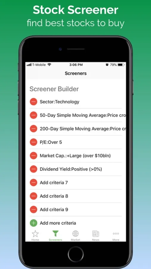 - Hundreds of criteria: Technical (prices, RSI, SMA, etc) & Fundamental (P/E, PEG, Price/Cash, etc.)