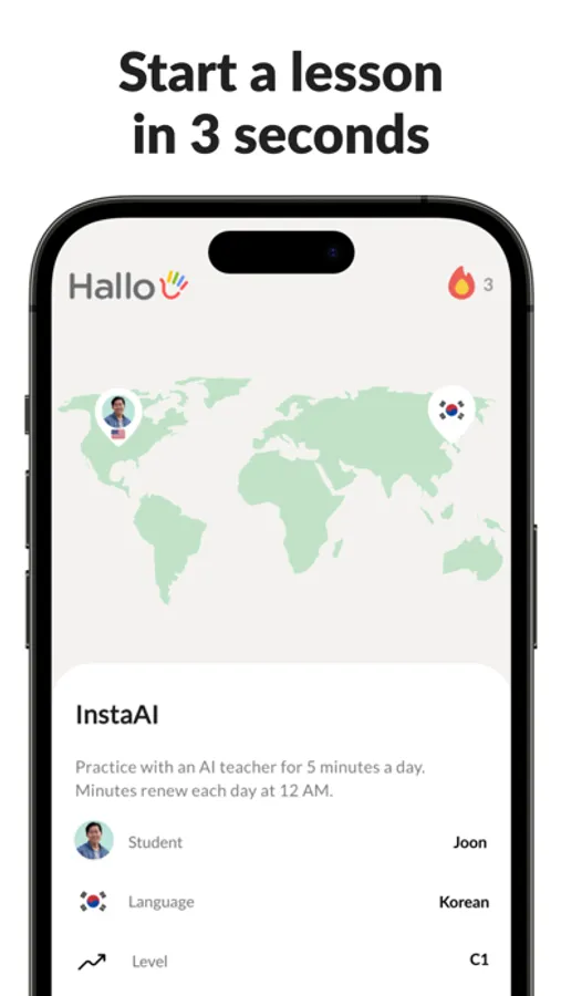• Hallo helps you speak - Press a button and start practicing in 3 seconds. Improve your communication skills with AI and native teachers to build your confidence and become a fluent speaker!