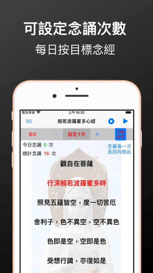 設立「設定次數」功能,您可以選擇想念誦的次數,並按右上角的「次數設定」,再按右上角的三角形播放鍵,您可以選擇想念誦的次數,並按右上角的「次數設定」。當數字顯示紅色,顯示「設定某次」或「剩餘某次」,這樣「粵語心經」念佛機會自動按照你選擇的次數念誦,並在完成念誦後自動以您的名義回向。
