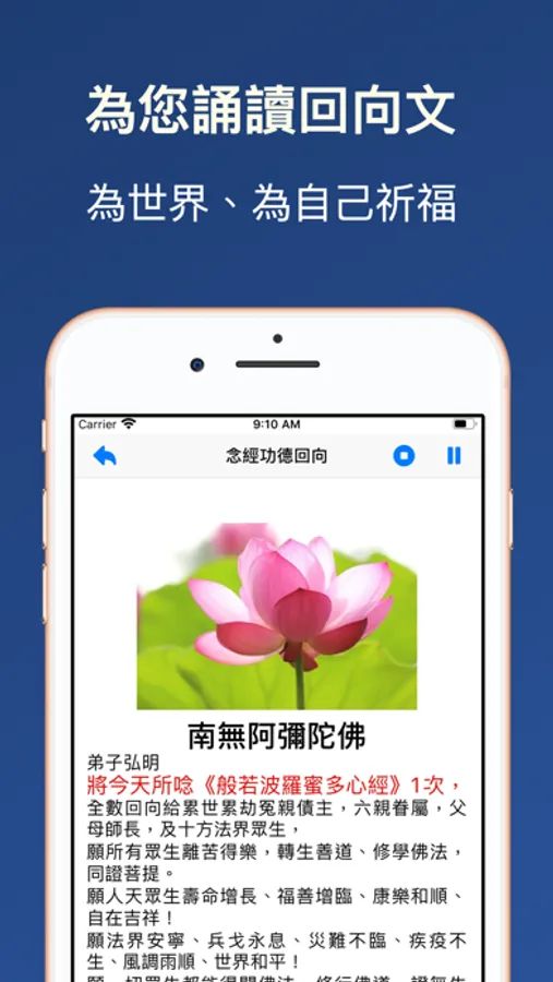 提供背景播放功能,「粵語心經」程式可以在您關閉屏幕下繼續念誦咒文而不會中斷。