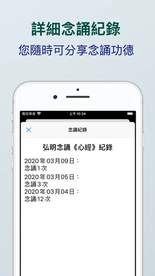 自動紀錄每日念誦不同咒的次數,供日後參考及回向,可以在主頁面底部查閱過往念誦的紀錄,並均設附帶回向文的分享功能,歡迎您與好友分享。