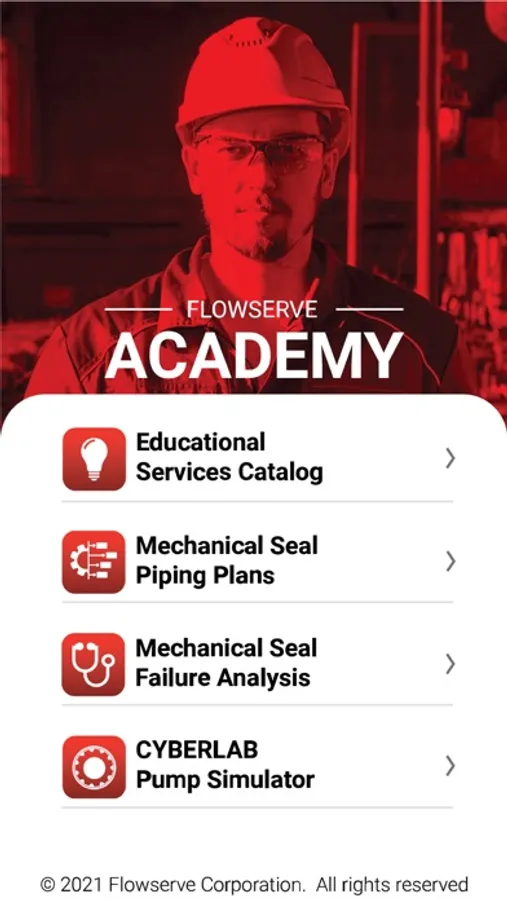 The Flowserve Academy is intended to give customers access to a wide range of industry expertise including best practices, product knowledge, and digital solutions. Currently, the platform offers four valuable tools, the Educational Services Digital Course Catalog, Mechanical Seal Piping Plans App, Seal Failure Analysis App, and Cyberlab Pump Simulator.