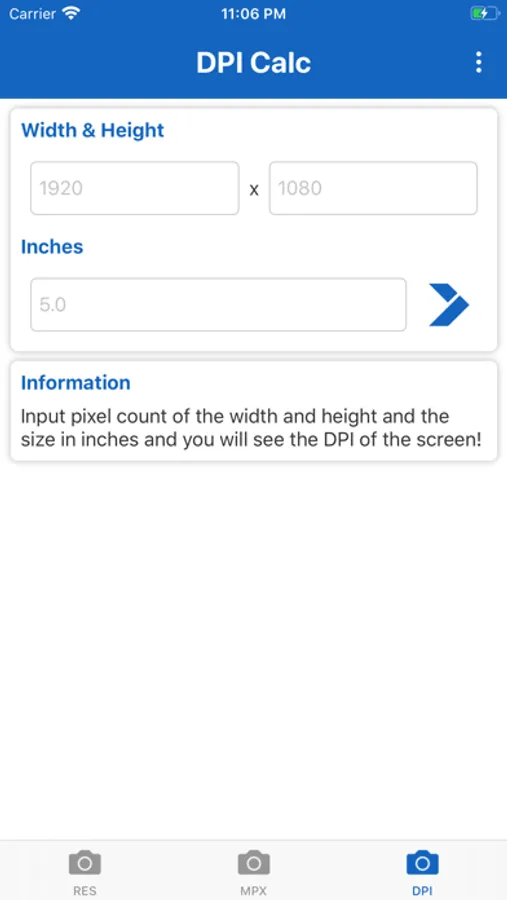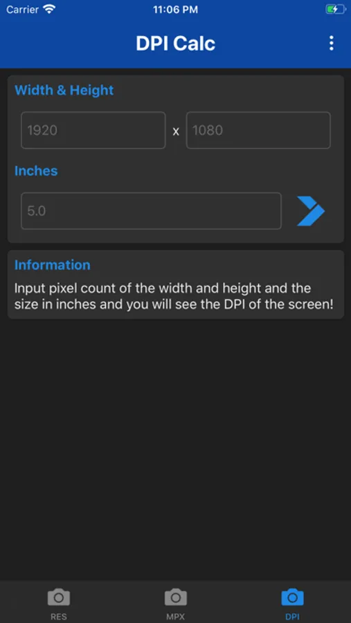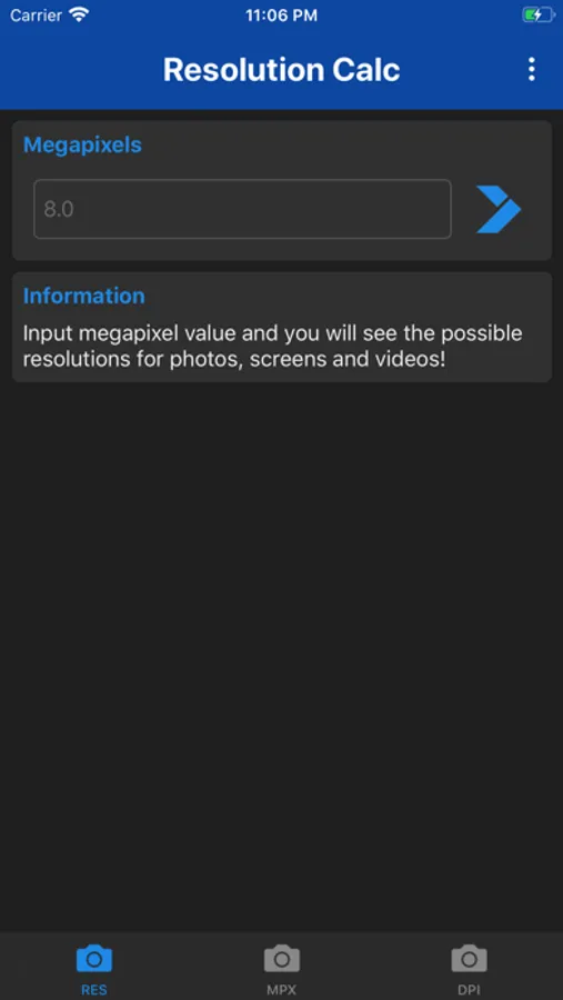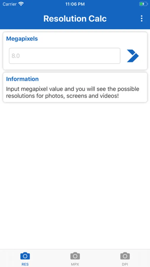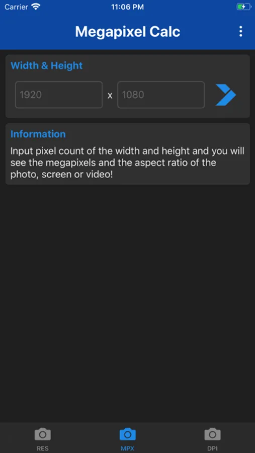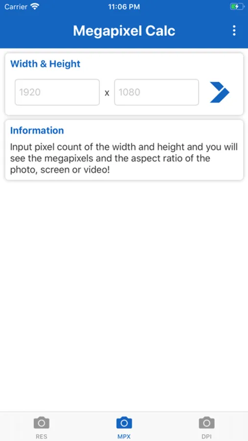 Megapixel Calculator is very useful and informative app for understanding different resolutions. Just type number of megapixels and you will see all possible variations of screen, photo and camera resolutions. Or even more - type the resolution of your photo, screen or camera, and the app will tell you the aspect ratio and number of megapixels. Now app includes DPI calculator. Just input screen resolution and size in inches, and the DPI of the screen will be shown.